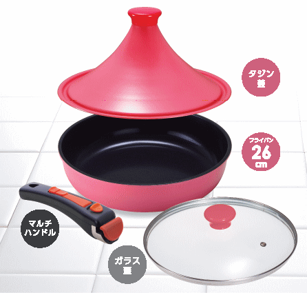 ギフト対応仕様◎フライパン 26cm◎タジン◎マルチハンドル◎ガラス蓋◎材質:本体アルミニウム合金/超硬質セラミック塗膜加工◎IH100/200対応 及び ガスなどのほとんどの熱源に対応 ◎レシピブック付セラミックコーティングダイナストーンにタジン鍋が付きました。少量油で調理してもこびりつきにくいの
